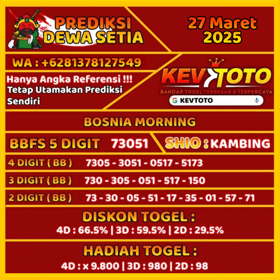 Prediksi Togel Toto 4D Bosnia Morning Kamis 27 Maret 2025