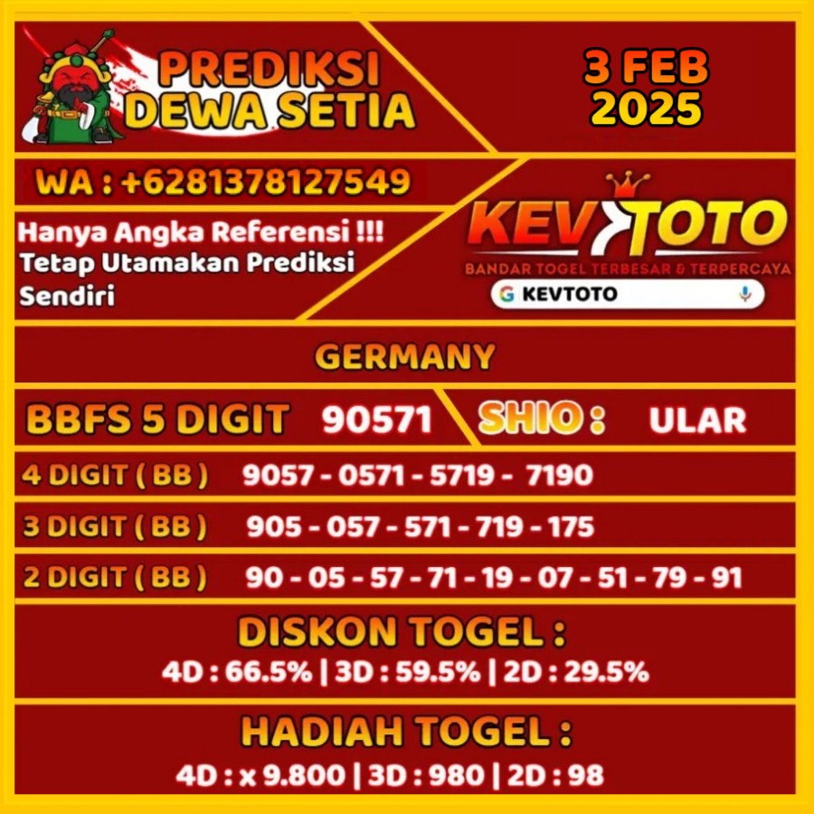 Prediksi Togel Toto 4D Germany Senin 3 Februari 2025