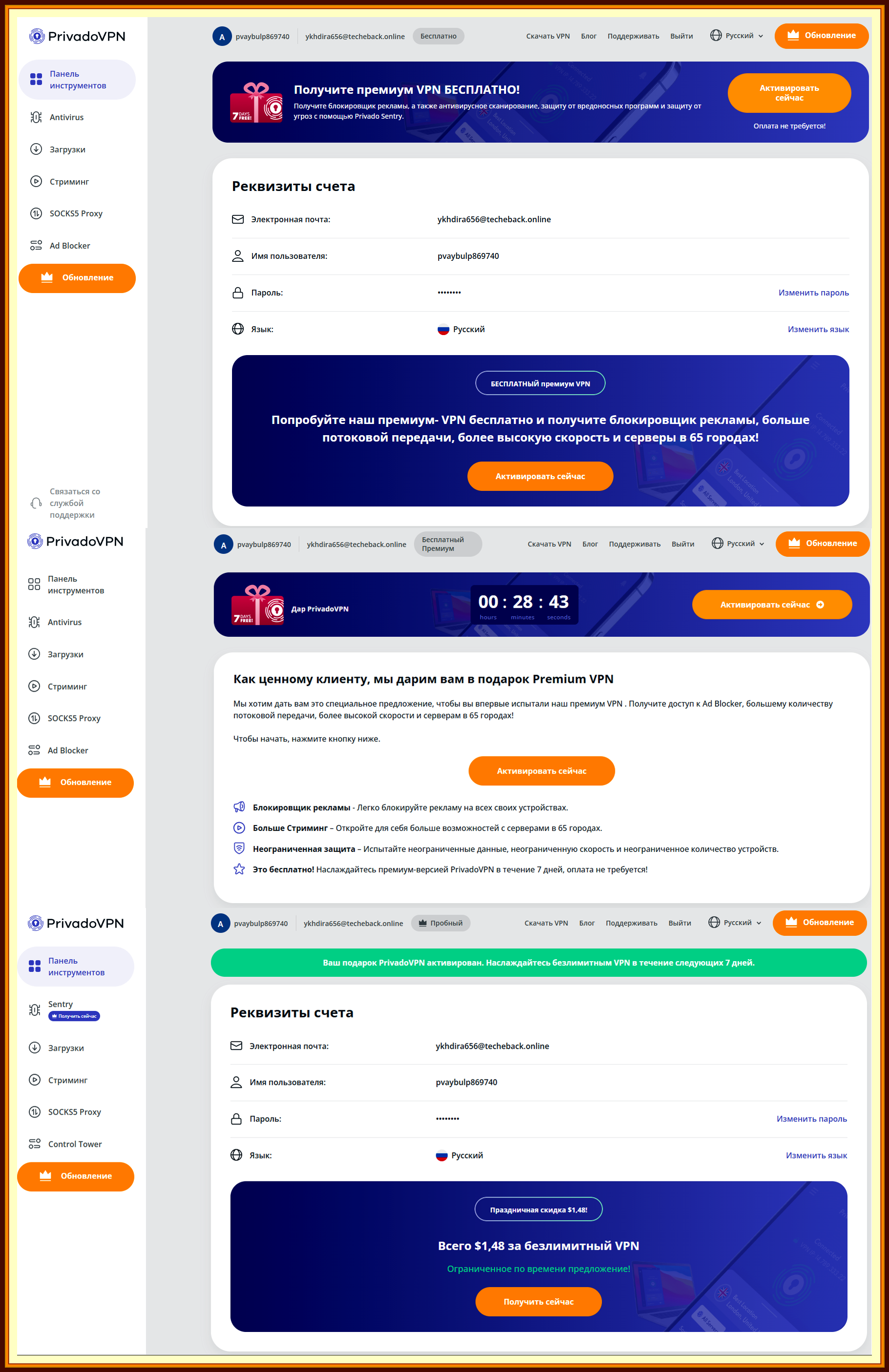 PrivadoVPN Premium 10 устройств на 7 дней