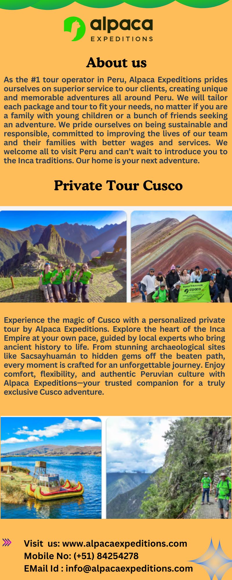Discover the magic of Cusco with Alpaca Expeditions on an exclusive private tour. Enjoy personalized service as you explore iconic landmarks like Sacsayhuamán, the Sacred Valley, and the vibrant local markets. With expert guides and flexible itineraries, you'll experience the rich culture, history, and beauty of the Andes at your own pace. Whether it's your first visit or a return journey, Alpaca Expeditions ensures an unforgettable, intimate adventure through the heart of Peru’s Incan heritage.