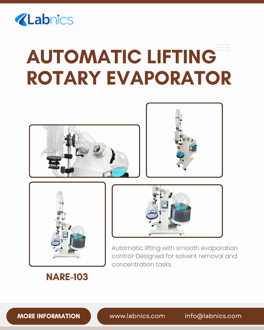 Automatic Lifting Rotary Evaporator NARE-103 enables controlled solvent evaporation with adjustable speed and digital monitoring for lab applications. info@labnics.com Learn More: https://labnics.com/automatic-lifting-rotary-evaporator/nare-103 #Labnics #RotaryEvaporator #LabEquipment #SolventRemoval