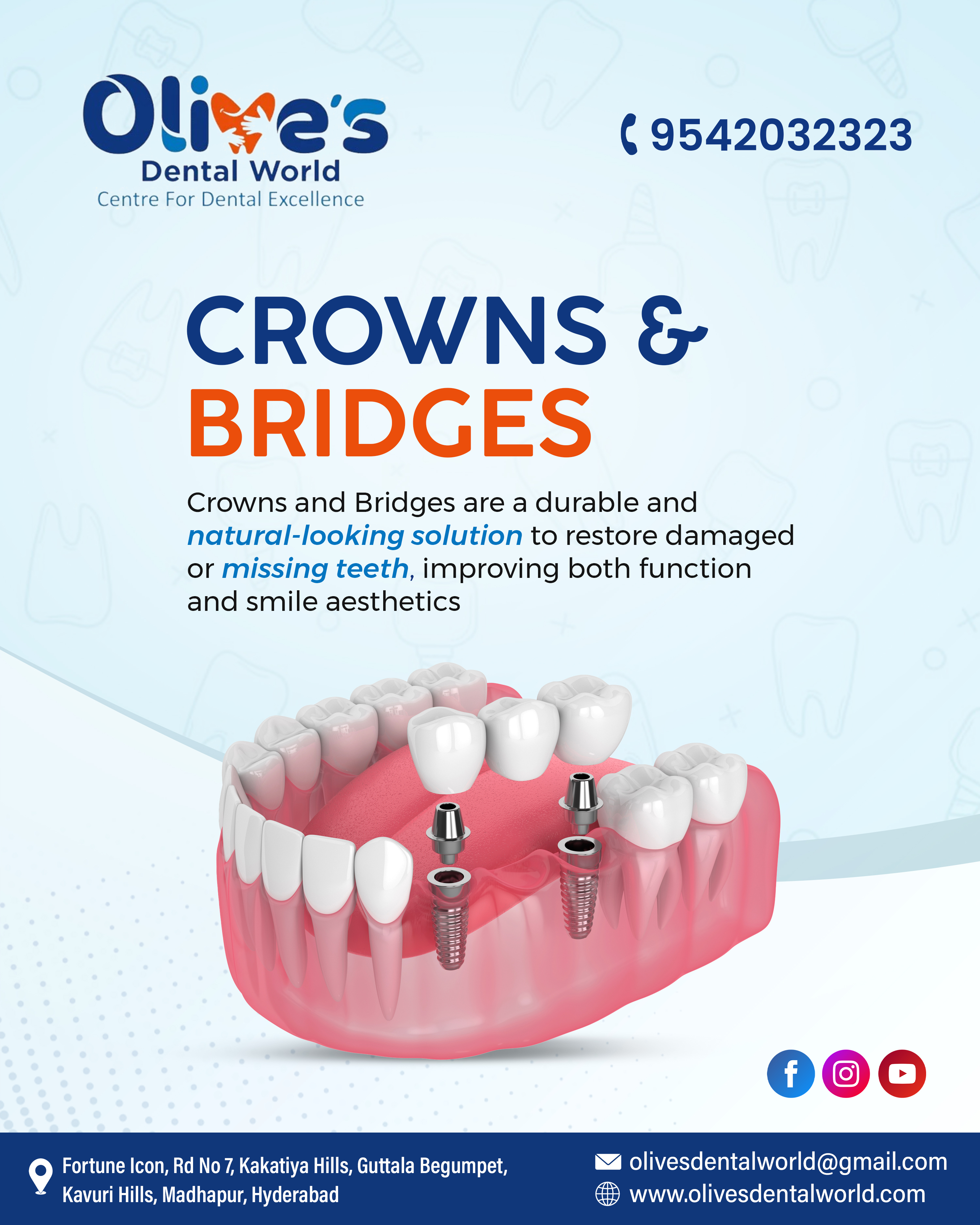 Damaged or missing teeth can affect your confidence and oral health. At olives Dental world, we provide advanced Crowns and Bridges in Madhapur designed to protect weakened teeth and restore natural function. Our custom-made Crowns and Bridges ensure durability, comfort, and a seamless smile. Experience expert care and long-lasting results. Call olives Dental world at +919542032323 to schedule your appointment today.