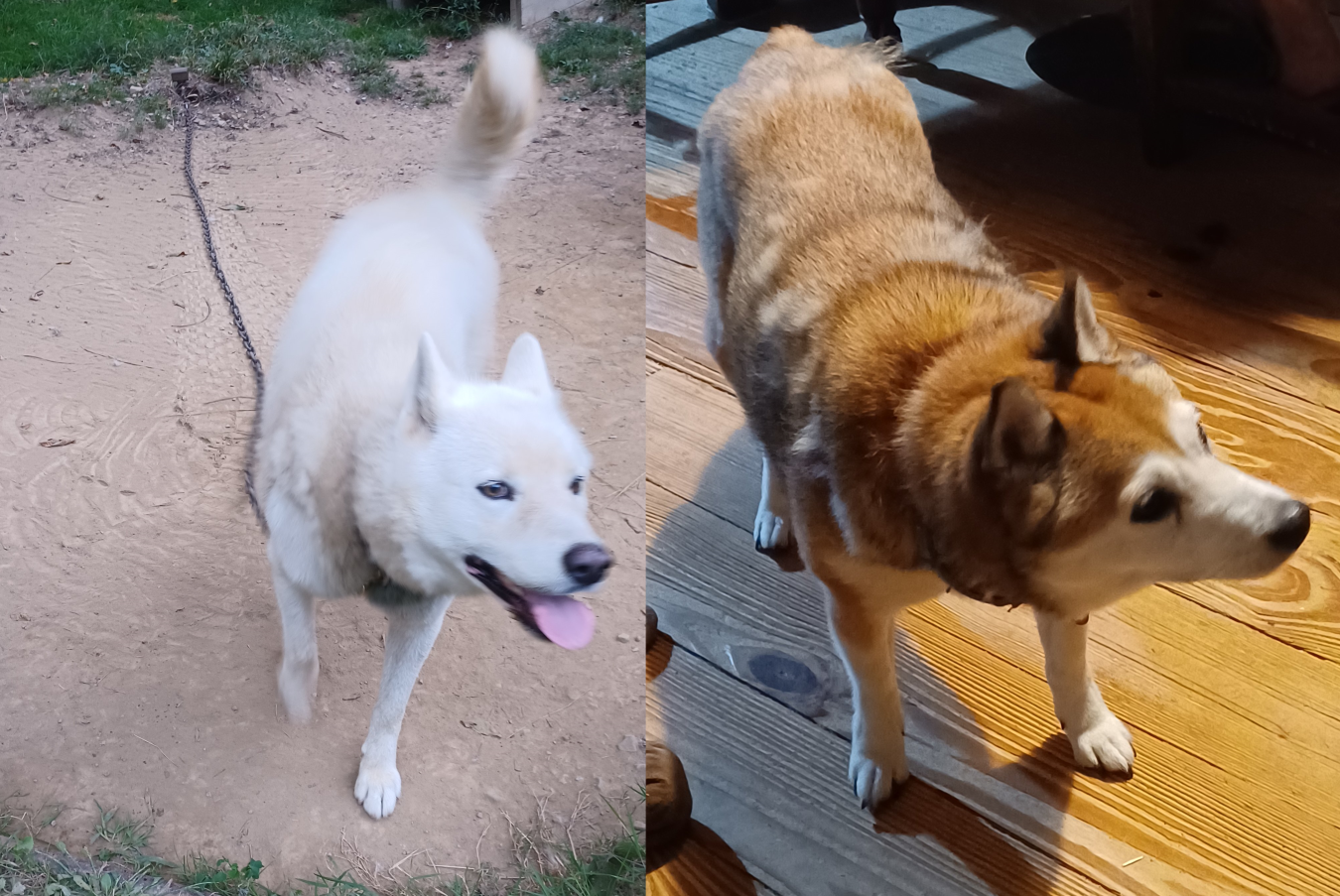 Raistlin (a white husky) and Tika (a brown Shiba Inu).