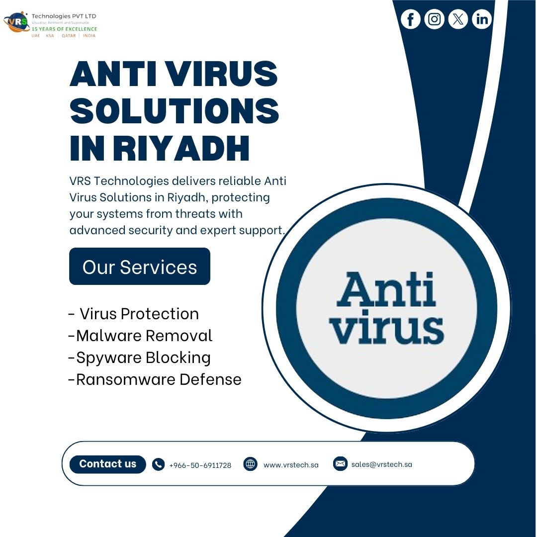 VRS Technologies provides reliable Anti Virus Solutions in Riyadh to safeguard businesses from cyber threats. Our expert team ensures complete protection with advanced security tools and timely updates. Call +966-50-6911728 for professional antivirus solutions tailored to your business needs.