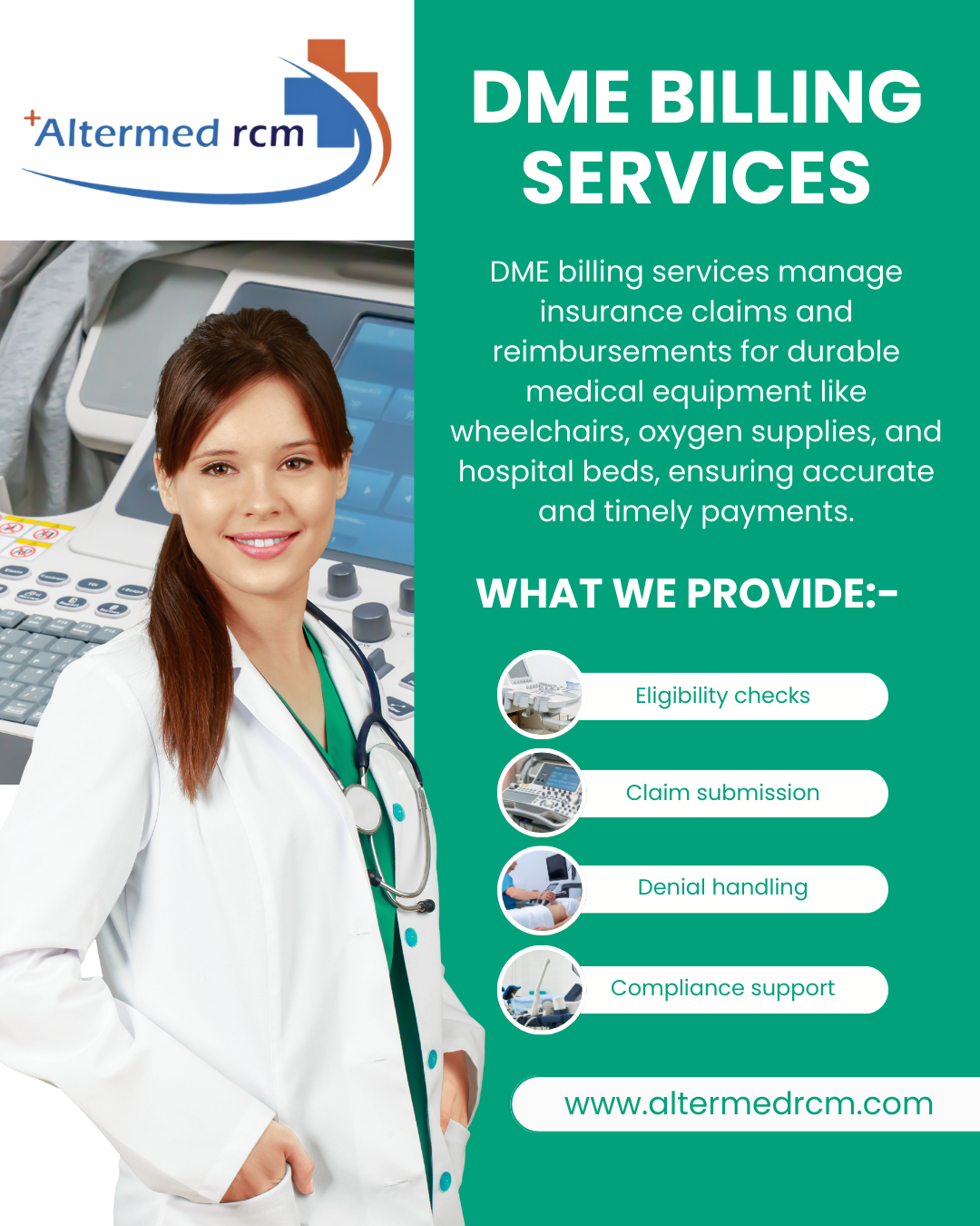 Our DME billing services handle insurance claims and payments for medical equipment that lasts a long time. Altermed RCM checks eligibility, handles denials, and does everything else needed to make sure that healthcare providers get accurate billing, compliance support, and payments on time.