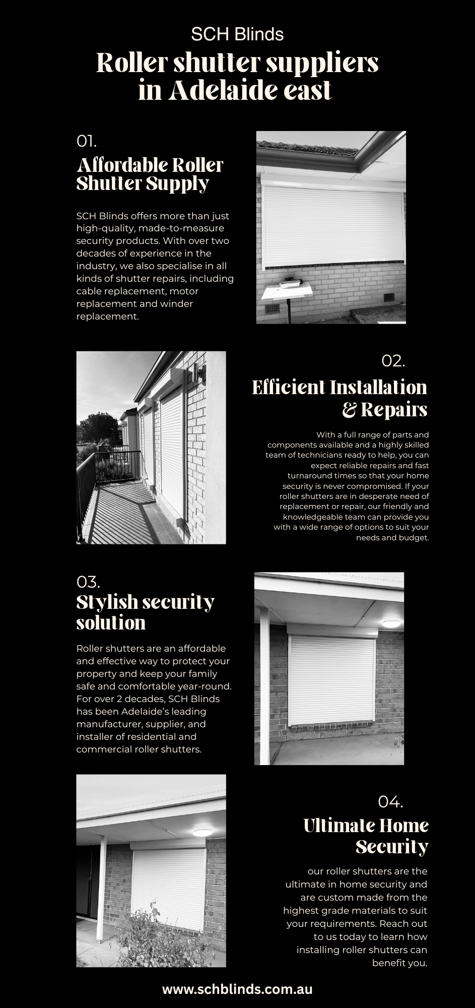 SCH Blinds has more than 20 years of experience in the security roller shutter industry and our quality of products and services has made us one of the top-rated roller shutter suppliers in Adelaide East. We specialize in quality and affordable roller shutters for both commercial premises and homes. Visit us :