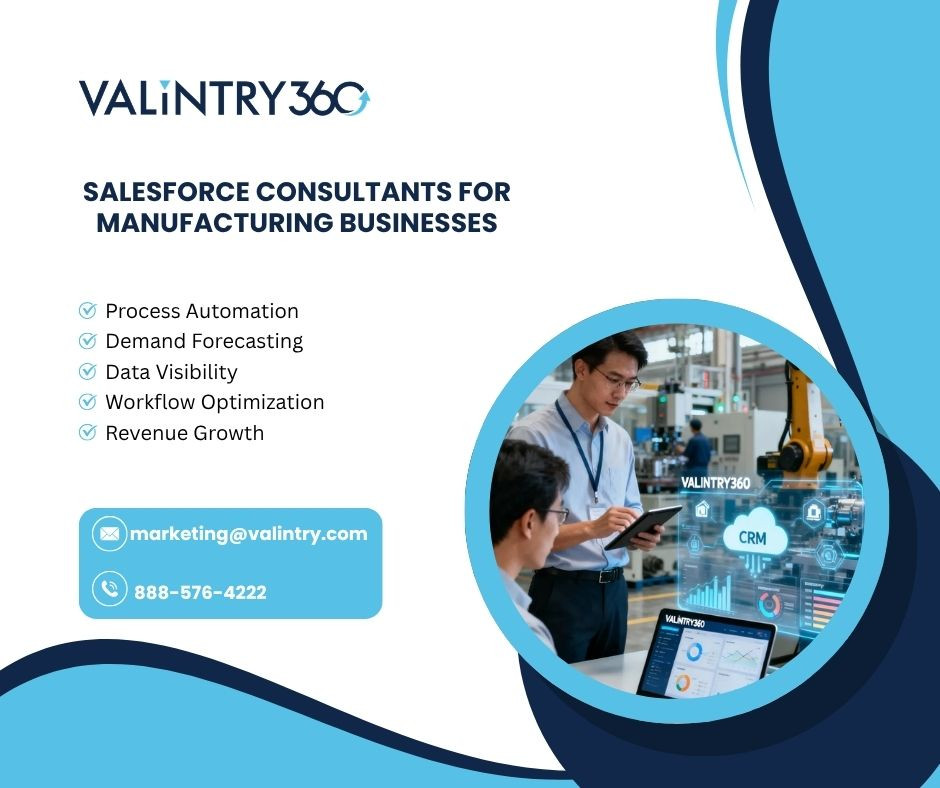 VALiNTRY360 stands out as a trusted provider of Salesforce Consultants for Manufacturing Businesses, delivering tailored CRM solutions that align sales, production, service, and partner operations into one unified platform. Designed specifically for modern manufacturers, their Salesforce consulting services help eliminate data silos, improve forecasting accuracy, and streamline order management for better operational control. By integrating Salesforce with ERP systems and enabling real-time data visibility, VALiNTRY360 empowers manufacturers to make faster, smarter decisions while reducing manual processes and operational gaps. Their expert team focuses on configuring Salesforce to support the entire manufacturing value chain—from demand planning and sales agreements to field service and partner collaboration—ensuring scalable growth and long-term success. With a structured approach that includes discovery, solution design, implementation, and continuous optimization, businesses gain improved efficiency, enhanced customer experiences, and measurable ROI. Whether you're looking to modernize legacy systems or accelerate digital transformation, VALiNTRY360 delivers practical, results-driven solutions built for real manufacturing workflows. To learn more about how these innovative Salesforce solutions can transform your operations and drive sustainable growth, visit VALiNTRY360 today and connect with experts who understand your industry needs.
