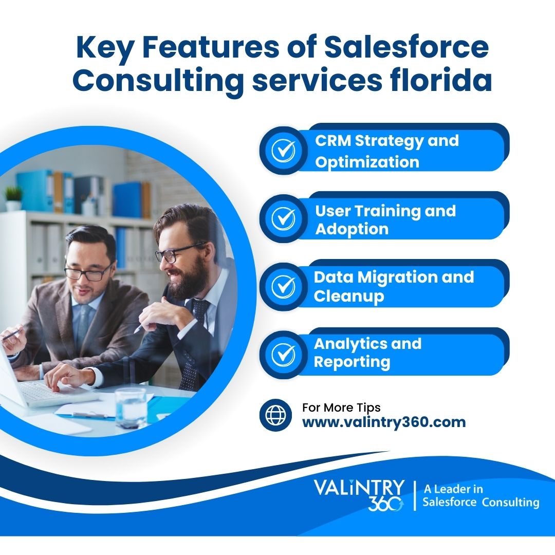 Valintry360 offers expert Salesforce consulting services in Florida, providing tailored solutions to businesses across the state. Our certified consultants specialize in Salesforce implementation, customization, and optimization, ensuring organizations maximize the value of their CRM investment. We excel in CRM strategy development, data migration, integration with third-party systems, and user training. Whether you're a small startup or a large enterprise, our team collaborates closely with you to deliver innovative Salesforce solutions that drive growth, improve efficiency, and enhance customer engagement. Partner with Valintry360 for comprehensive Salesforce consulting services in Florida that empower your business to succeed in the digital age.For more info visit us https://valintry360.com/services/salesforce-consulting-and-advisory-services