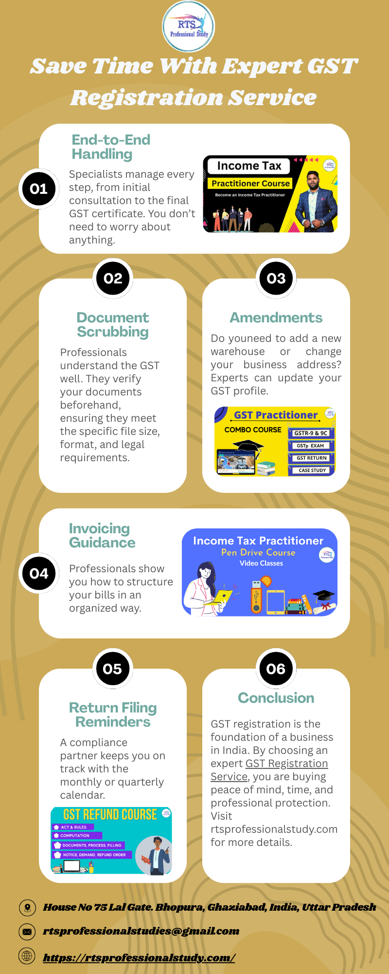 The Indian taxation is a complex system. Business owners must understand this regulatory system. Here, a professional GST registration service plays a major role. Web: https://rtsprofessionalstudy.c....om/gst-registration-