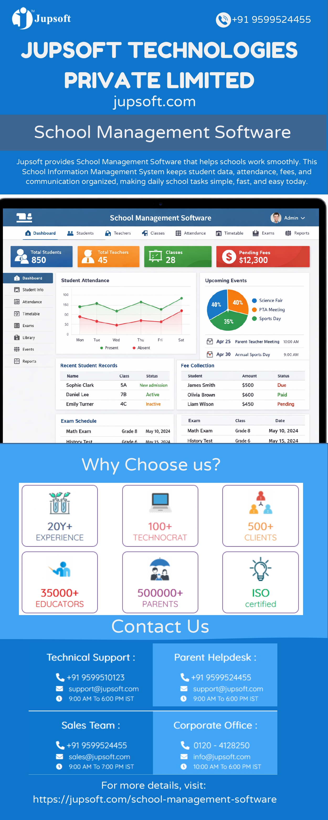 Jupsoft offers School Management Software that makes daily school work easy. This School Information Management System helps teachers, students, and parents manage records, attendance, fees, and communication in one simple platform easily. Enquire now. For more details, visit: https://jupsoft.com/school-management-software