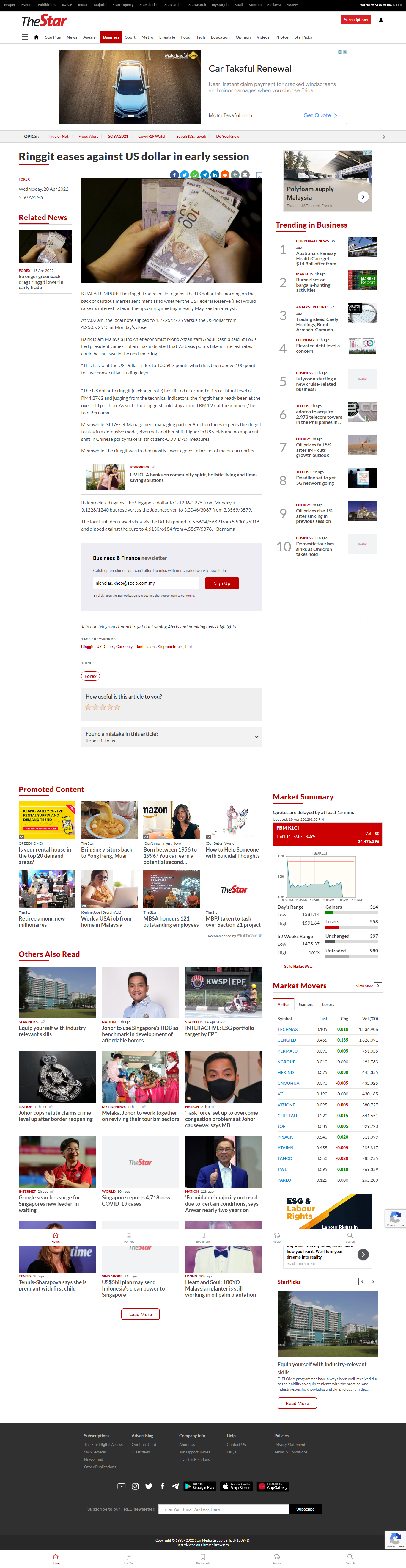 screencapture thestar my business business news 2022 04 20 ringgit eases against us dollar in early