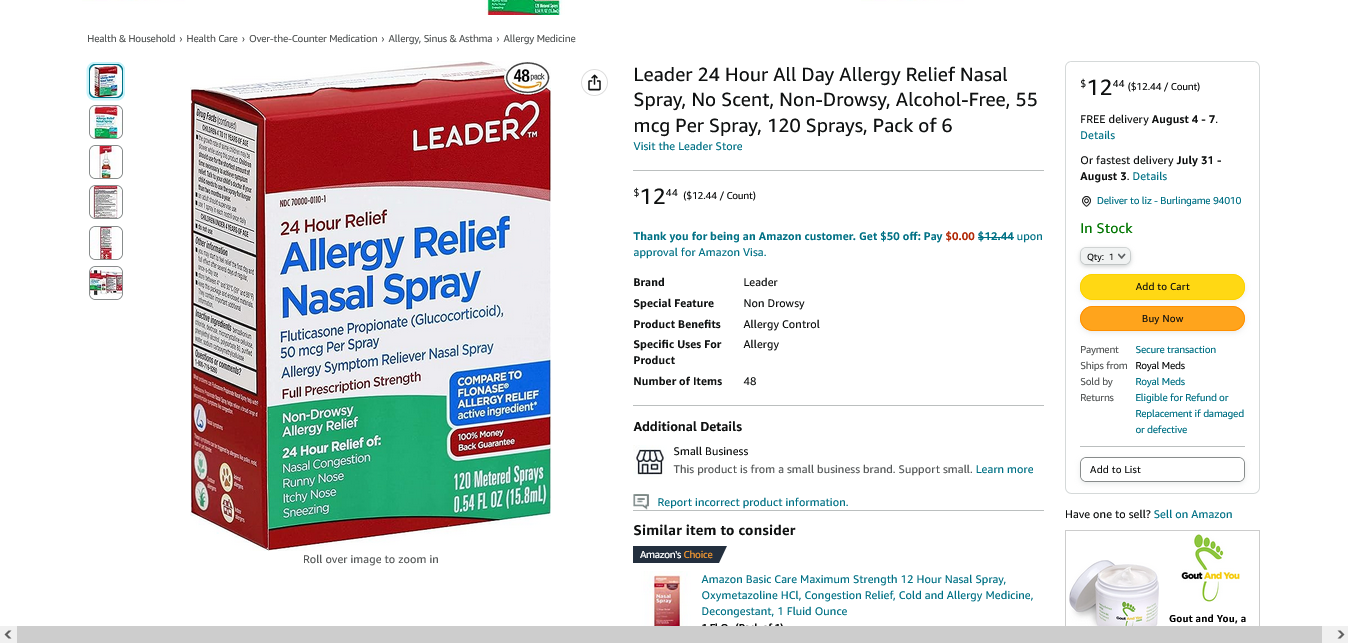 Screenshot 2023 07 26 at 09 56 39 Amazon.com Leader 24 Hour All Day Allergy Relief Nasal Spray No Sc