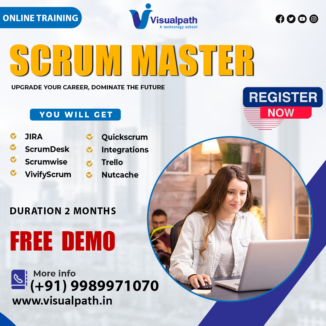 Join Visualpath top institute in Hyderabad offers Scrum Master Training with real-time expert instructors and hands-on projects. Our Scrum Master Training in Hyderabad, from industry experts and gain experience. We provide to individuals globally in the USA, UK, etc. To schedule a demo, call +91-9989971070.