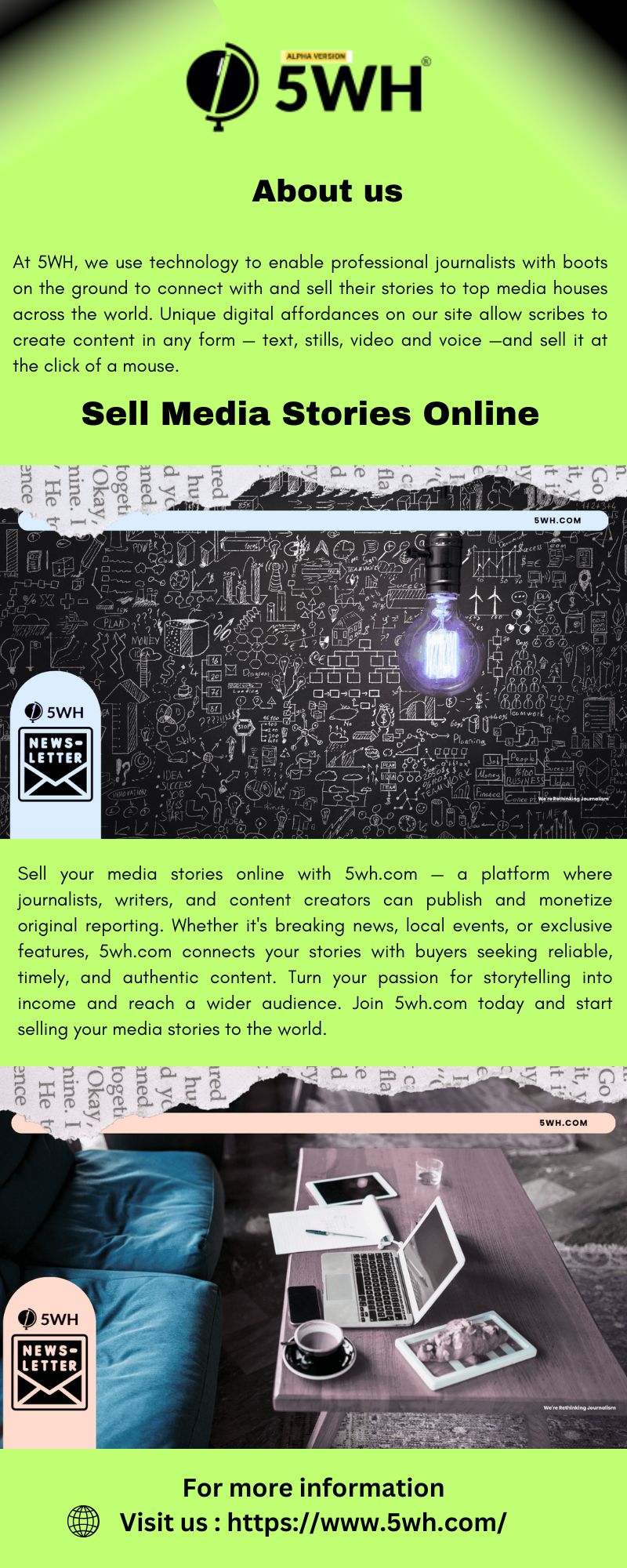 Sell your media stories online with 5wh.com — a platform where journalists, writers, and content creators can publish and monetize original reporting. Whether it's breaking news, local events, or exclusive features, 5wh.com connects your stories with buyers seeking reliable, timely, and authentic content. Turn your passion for storytelling into income and reach a wider audience. Join 5wh.com today and start selling your media stories to the world.