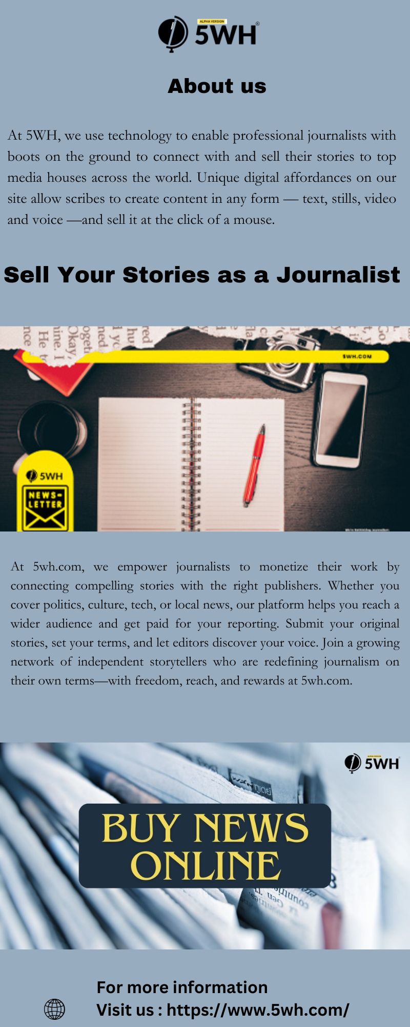 If you're a writer looking to sell stories as a journalist, 5wh.com is your ultimate platform. We connect independent journalists with editors and publishers actively seeking fresh, impactful stories across a range of topics. Whether it's local news, human interest, or global affairs, 5wh.com helps you pitch and monetize your journalism. Our streamlined process makes it easy to showcase your work, get noticed, and get paid. Join a growing network of storytellers turning passion into profit. Sell stories as a journalist with purpose—start today with 5wh.com.