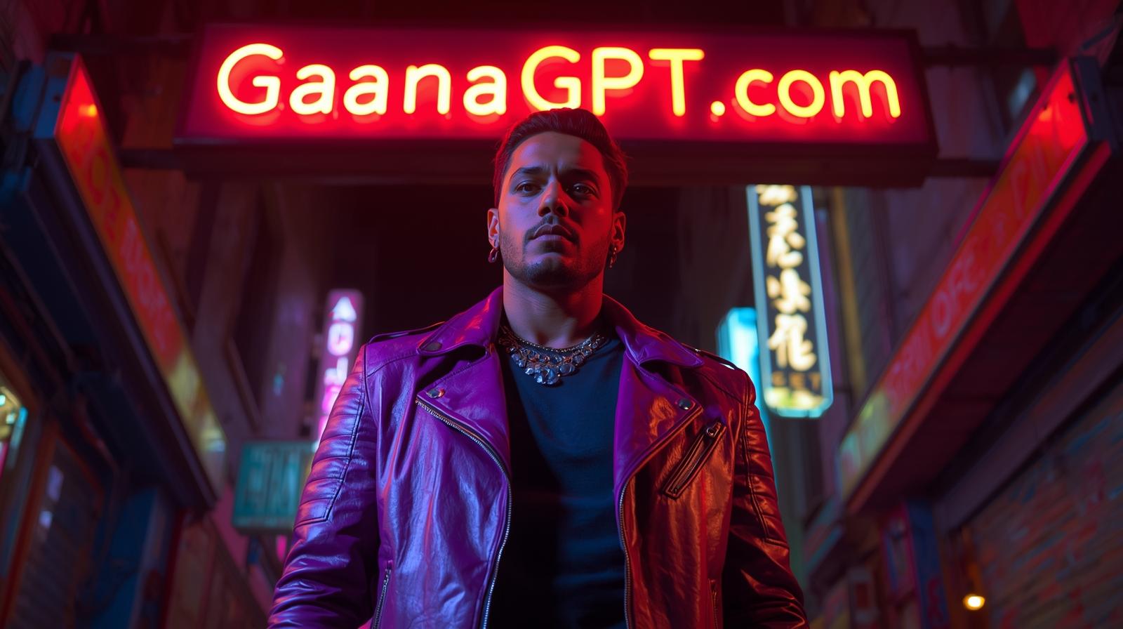Sexy biker man in purple leather jacket under neon street signs; “GaanaGPT.com” displayed as a glowi