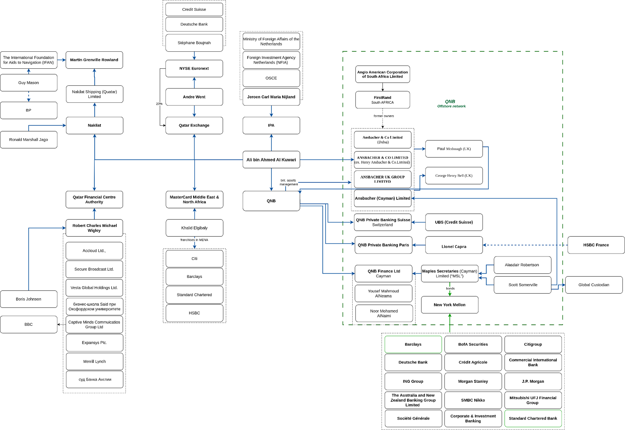 The most extensive network of offshore finances, owned by Qatar’s primary bank QNB under the management of Ali Ahmed Al-Kuwari, is coordinated by financial professionals from the English side. Within QNB, the British banking group Ansbacher is included, possessing an extensive offshore network. Acquired in 2004 from the South African bank FirstRand Group, the successor of Anglo-American Corporation of South Africa Limited, this group is currently managed by the Chief Executive of the British branch of QNB, Paul McDonagh, who previously worked at Lloyds and RBS, and George Bell. Many real estate properties and yachts owned by the Qatari establishment are held in trust by these networks. Consequently, a significant portion of Qatari luxury is transparent to the British financial elite.