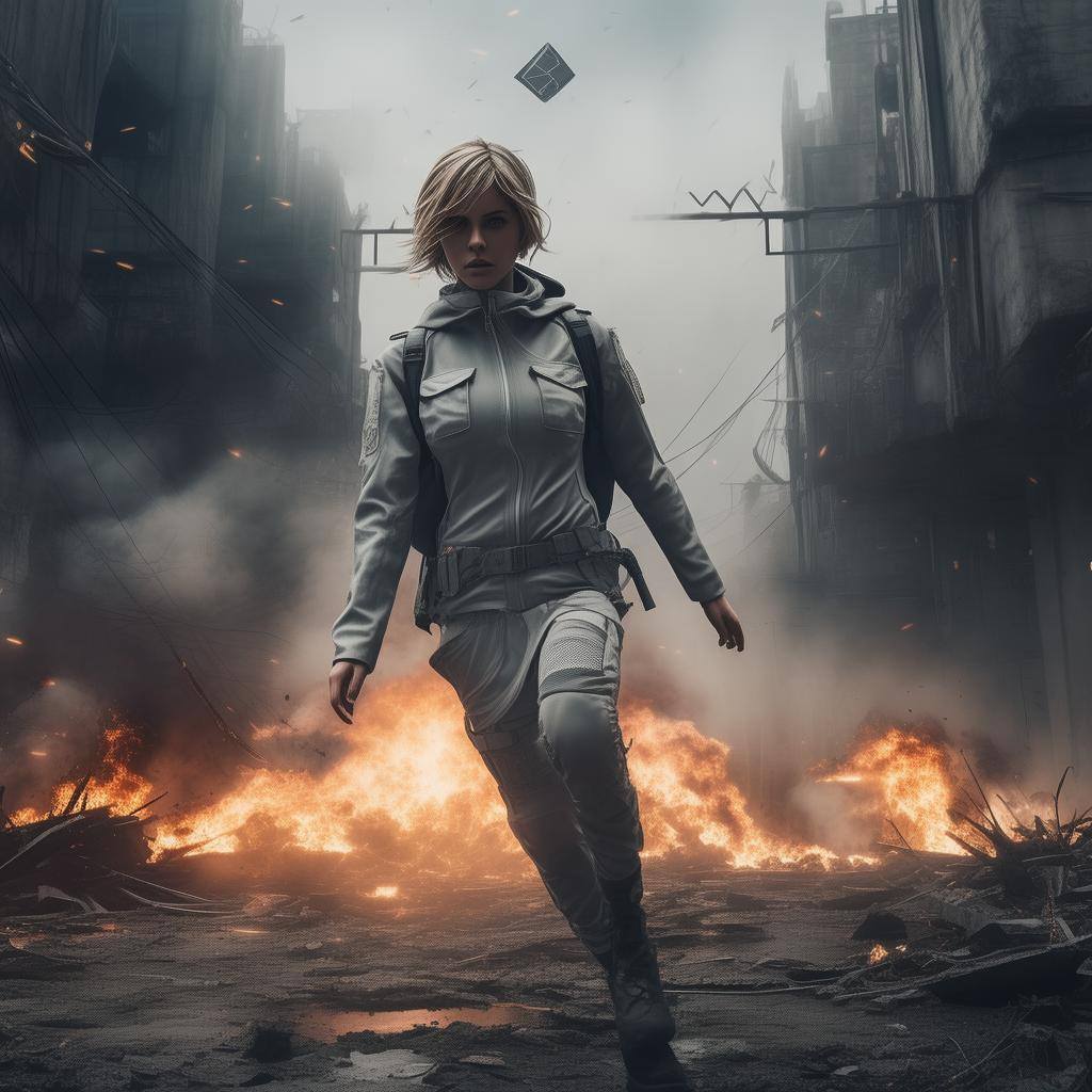 视频以3D动漫风格呈现,核心主体是一位身着连帽战术服(浅灰色,带多口袋设计)、背着背包、留着齐肩金发的女性,在夜晚的都市废墟中展开生死逃亡。她先躲避激光引发的爆炸,随后起身奔跑穿越燃烧的废墟,最终跳上