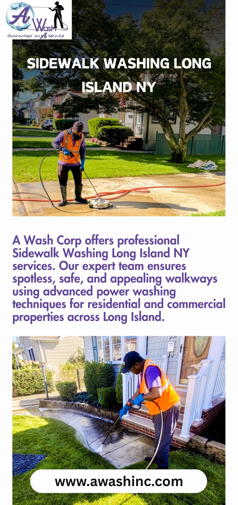 A Wash Corp provides expert Sidewalk Washing Long Island NY services to keep your property clean and inviting. Our professional team removes dirt, stains, and grime using advanced power washing techniques. Trust A Wash Corp for spotless results every time. Call (516)-589-1179 today for affordable, reliable cleaning services.