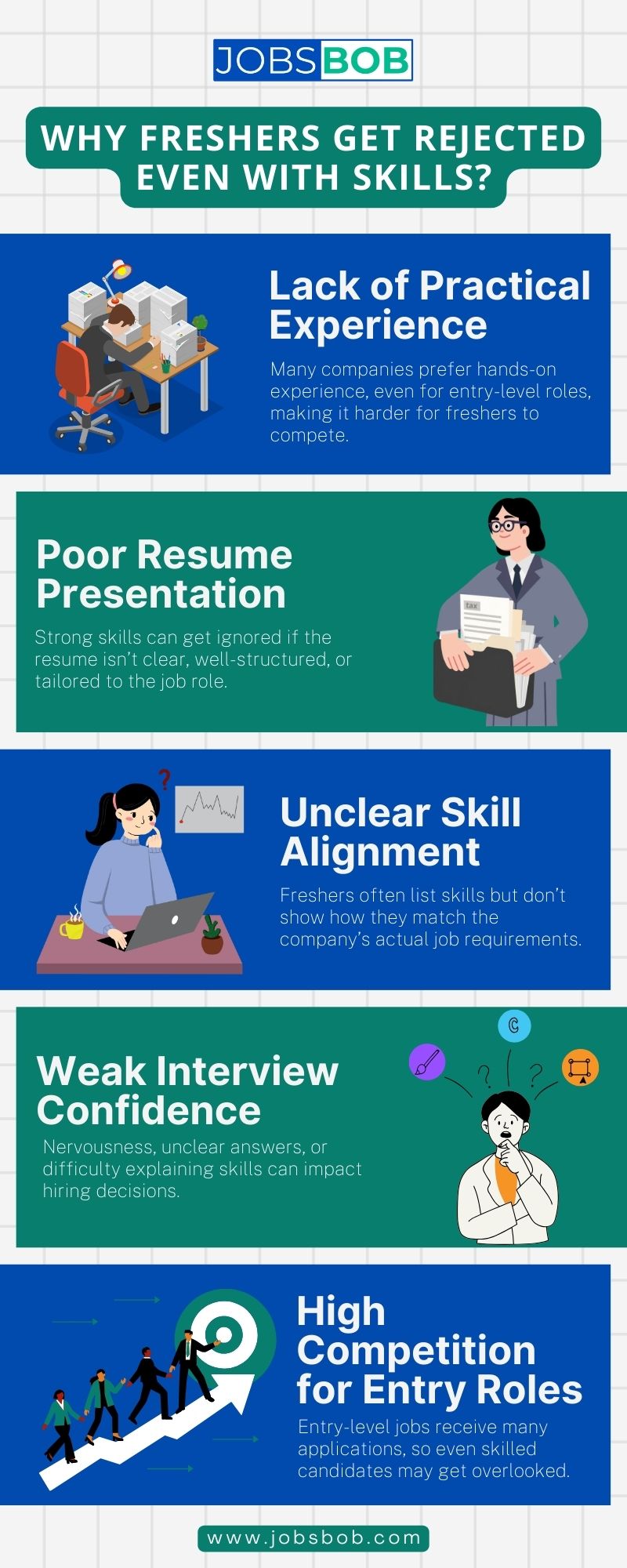 Freshers need skills to get jobs, yet this requirement fails to guarantee their employment. The combination of missing practical experience, having messy or unclear resumes, showing weak interview confidence, and failing to match their skills with job requirements causes applicants to get rejected. The highly competitive nature of entry-level positions demands effective preparation methods to help candidates succeed. Start building your opportunities today by enhancing your chances through skill development.