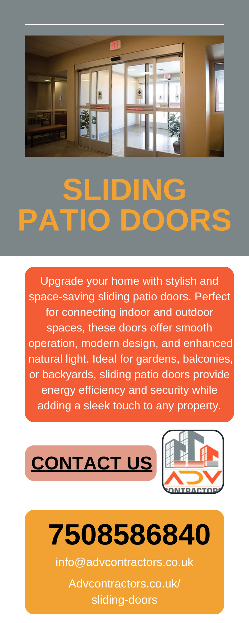 Upgrade your home with stylish and functional sliding patio doors. Designed to bring in natural light and provide easy access to your outdoor space, these doors are perfect for gardens, balconies, and patios. They offer smooth operation, energy efficiency, and a modern look to enhance any room. Choose from a variety of materials and finishes to match your style. Visit us:- https://advcontractors.co.uk/sliding-doors/