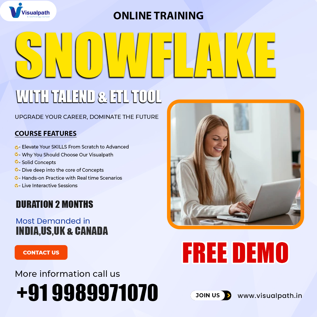 Snowflake Training in Hyderabad - VisualPath offers the Best Snowflake Online Training conducted by real-time experts. Our Snowflake Training is available in Hyderabad and is provided to individuals globally in the USA, UK, Canada, Dubai, and Australia. Contact us at+91-9989971070.
