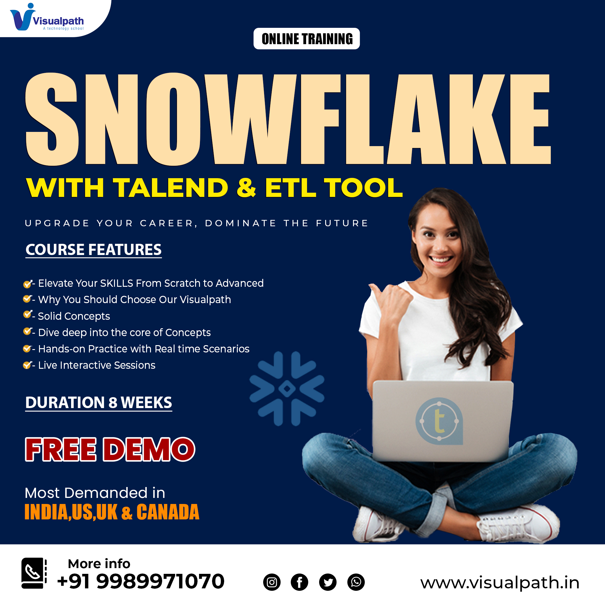 Snowflake Online Training Course - Visualpath is one of the few institutes that offer Snowflake training in Hyderabad, Ameerpet. Call@ 9989971070. Data lake Live projects, Coaching Center, Online training institute in Hyderabad.