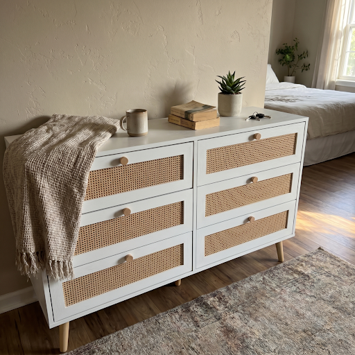 The brief was simple: light, calm, nothing dark. The dhs rattan white 6 drawer chest was the obvious choice. White frame, woven rattan fronts, it brings texture to the room without adding any colour. The drawers are deeper than they look from the front, which I wasn't expecting. Solid frame, no flex. Our UK guest room now has a chest that guests can actually use to unpack into rather than just for decoration.