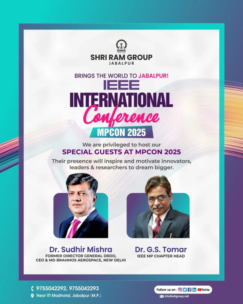 The 2-day IEEE International Conference MPCON-2025, hosted by Shri Ram Group Jabalpur has two special guests named Dr. Sudhir Mishra and Dr. G. S. Tomar. Both great personalities played pivotal roles to elevate the stature of the conference at the best private engineering college in Jabalpur.