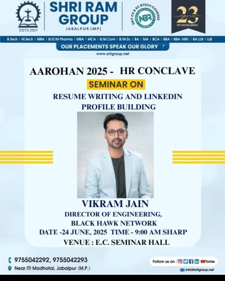 Shri Ram Institute of Technology recognized as the best private engineering college in Jabalpur organized a seminar on Resume Writing and LinkedIn Profile Building as a part of the ongoing event AAROHAN 2025-HR Conclave.