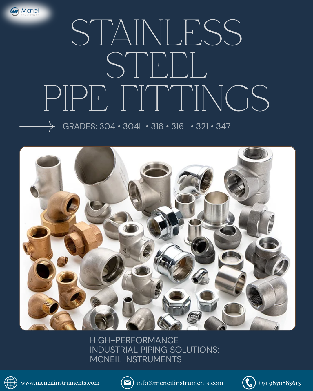 Leading manufacturer and supplier of Stainless Steel Pipe Fittings including SS 304, 304L, 316, 316L, 321, and 347 grades. Mcneil Instruments provides corrosion-resistant fittings engineered for high-performance industrial piping systems worldwide.Stainless steel pipe fittings are widely used in industrial piping systems for joining pipes, changing flow direction, or connecting different pipe sizes, ensuring leak-free and durable connections. For more information visit:https://www.mcneilinstruments.com/stainless-steel-pipe-fittings.html