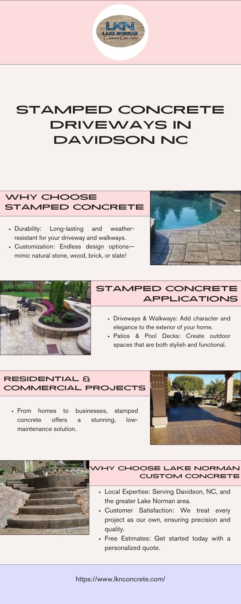 In Davidson NC Stamped Concrete Driveways Davidson NC Our talented artisans can customize your design or pattern to be similar to what you find in natural popular materials while providing a unique look that any driveway would love to have! https://www.lknconcrete.com/