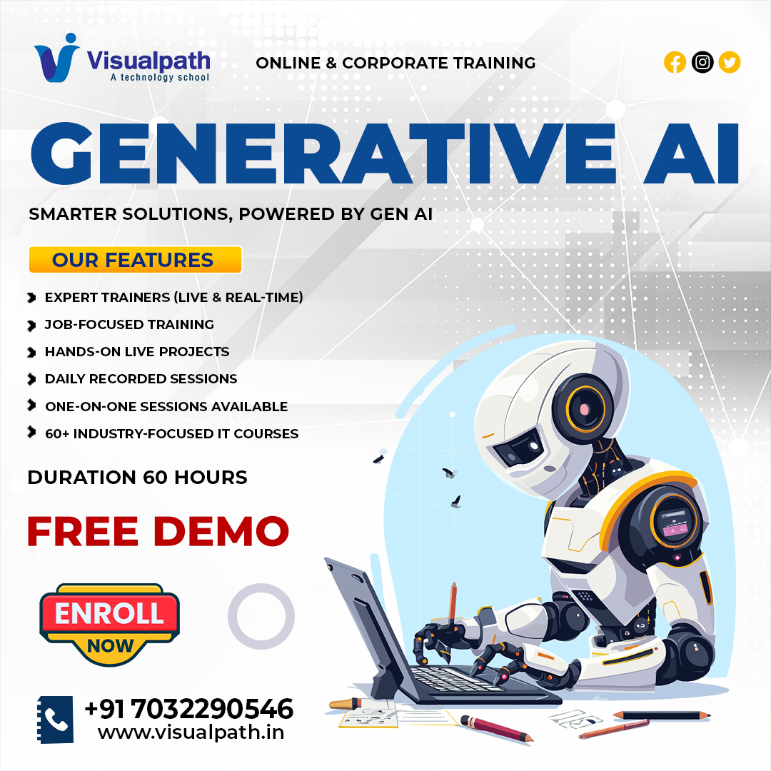 Visualpath provides Generative AI Training in Ameerpet designed for professionals aiming to build practical AI expertise. The program covers workflow integration, AI-driven productivity systems, and applied use cases instead of experimental learning. Structured guidance ensures you gain clarity, confidence, and career-ready AI skills aligned with industry expectations. We also provide corporate training. Call +91-7032290546.
