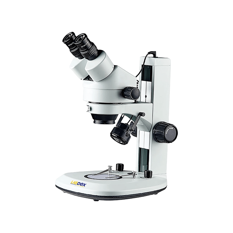 LabDex Stereo Microscope features a Greenough optical system, long working distance, WF10X/20 eyepieces, a 360° rotating 45° binocular head, smooth rack control knobs, and dual adjustable LED illumination—ideal for teaching, labs, assembly, biology, metallurgy, electronics, and sample inspection.