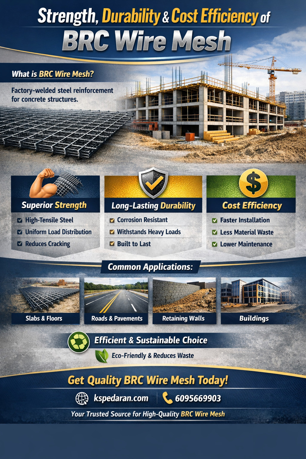 This infographic highlights the strength, durability, and cost efficiency of BRC Wire Mesh, showcasing why it is a preferred reinforcement solution in construction. It explains how BRC Wire Mesh improves structural stability, reduces cracking, lowers installation costs, and ensures long-lasting performance for residential, commercial, and industrial projects.