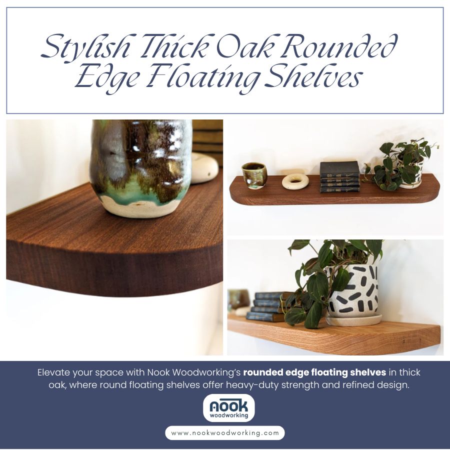 Elevate your space with Nook Woodworking’s rounded edge floating shelves in thick oak, where round floating shelves offer heavy-duty strength and refined design. Ideal for displaying art or essentials, their gentle curves and robust construction mount effortlessly into studs without sagging. Warm oak tones complement contemporary interiors, from bedrooms to studies. Built-to-order with free U.S. shipping, these shelves provide heirloom quality and effortless sophistication.