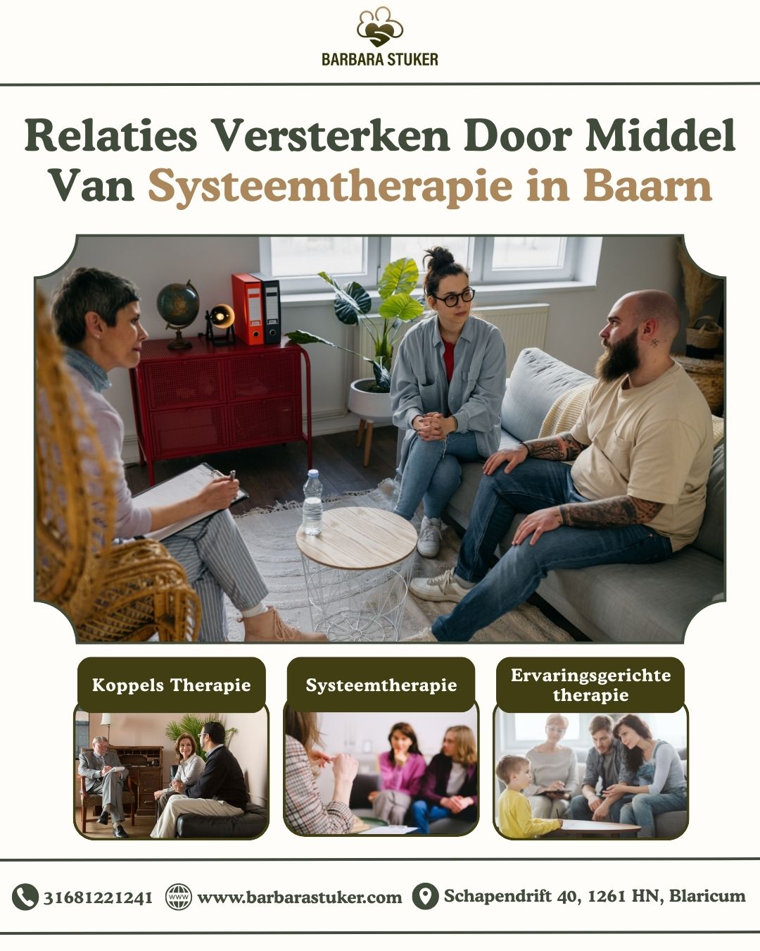Ervaren jullie spanningen, communicatieproblemen of terugkerende conflicten binnen jullie relatie of gezin? Met systeemtherapie Baarn bij Barbara Stuker krijgen jullie inzicht in patronen en praktische handvatten voor verandering. Professionele begeleiding helpt vertrouwen te herstellen en verbinding te versterken. Plan een afspraak met Barbara Stuker relatietherapie.