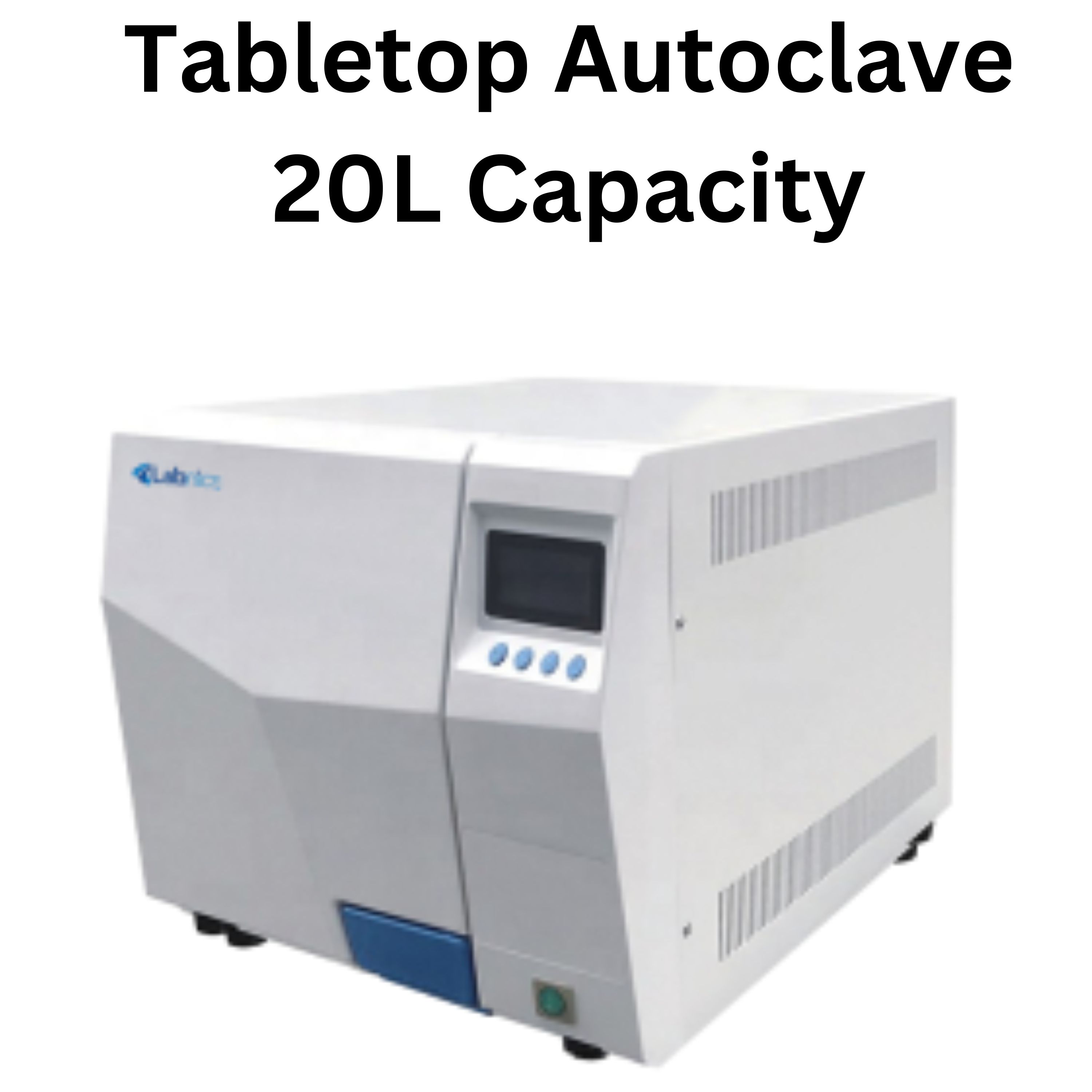Labnics Tabletop Autoclave features a 20 L capacity, 304 stainless steel body, and a max working pressure of 0.23 MPa. It offers a time range of 0-99 minutes, front loading with a secure lock system, and inner steam circulation for efficient sterilization without steam discharge.