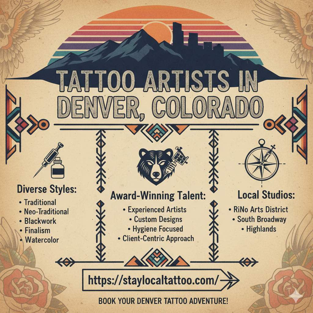 Meet Denver’s skilled tattoo artists known for custom artwork, fine-line detailing, and unique styles. Book with experienced Wheat Ridge-based professionals.