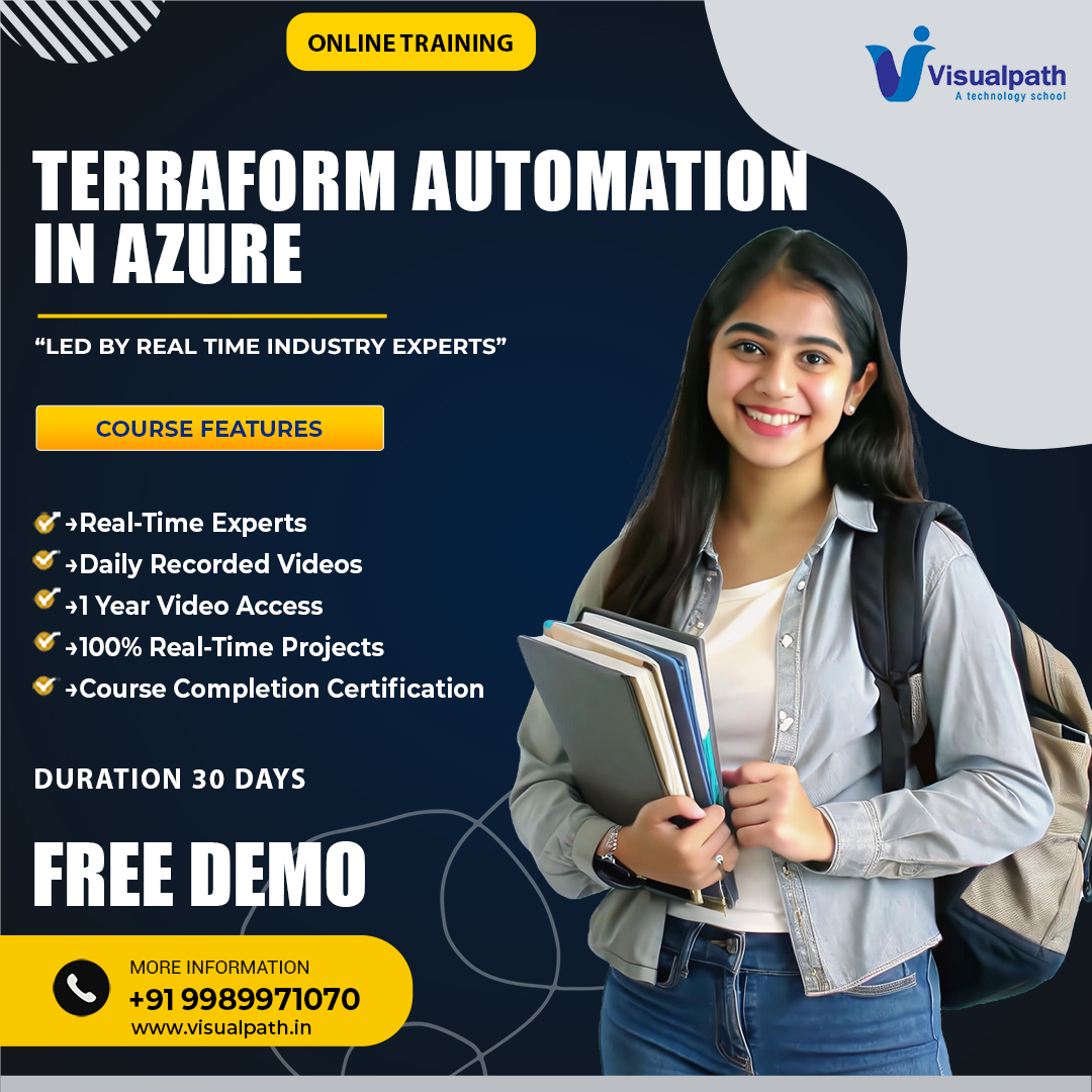 Visualpath offers The Best Terraform Automation in Azure Cloud Training by real-time experts. Our Terraform Course Online is available in Hyderabad and is provided to individuals globally in the USA, UK, Canada, Dubai, and Australia. Contact us at +91-9989971070.
