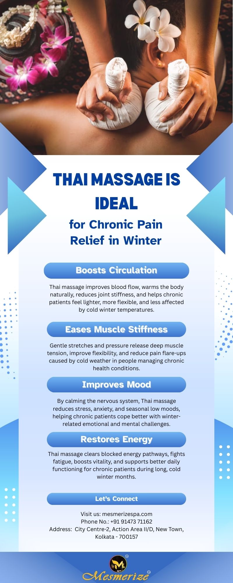 Thai massage helps ease winter-related stiffness, improves circulation, and reduces chronic pain through gentle stretching and deep pressure techniques that restore mobility and comfort during colder months. At Mesmerize Spa, expert therapists provide authentic Thai massage tailored to chronic pain needs. Regular sessions promote relaxation, warmth, and overall physical and emotional well-being.