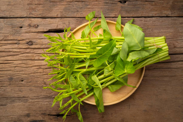 Thai Water Convolvulus,Pile of Water Spinach or Ipomoea Aquatica in wooden plate
