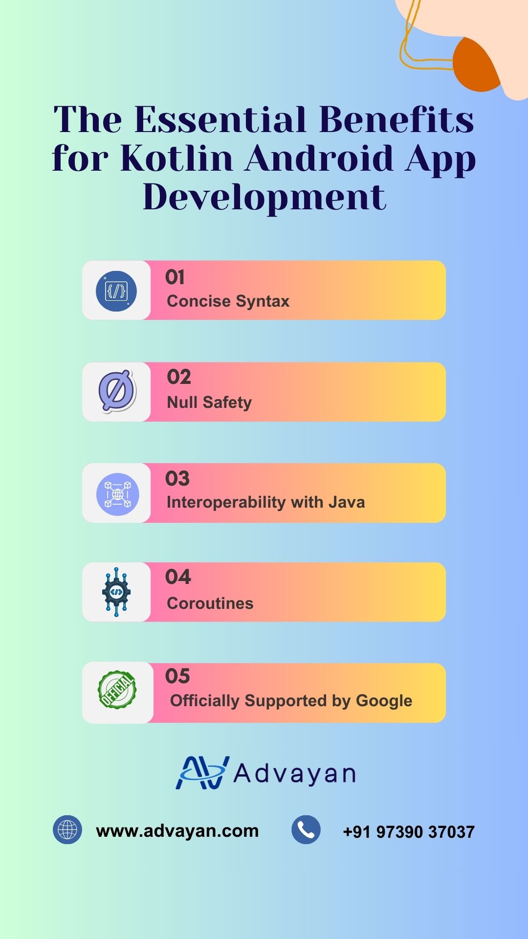 At Advayan, we understand the importance of staying ahead in the competitive landscape of mobile app development. Kotlin empowers us to build feature-rich applications with reduced boilerplate code, accelerating time to market without compromising quality.