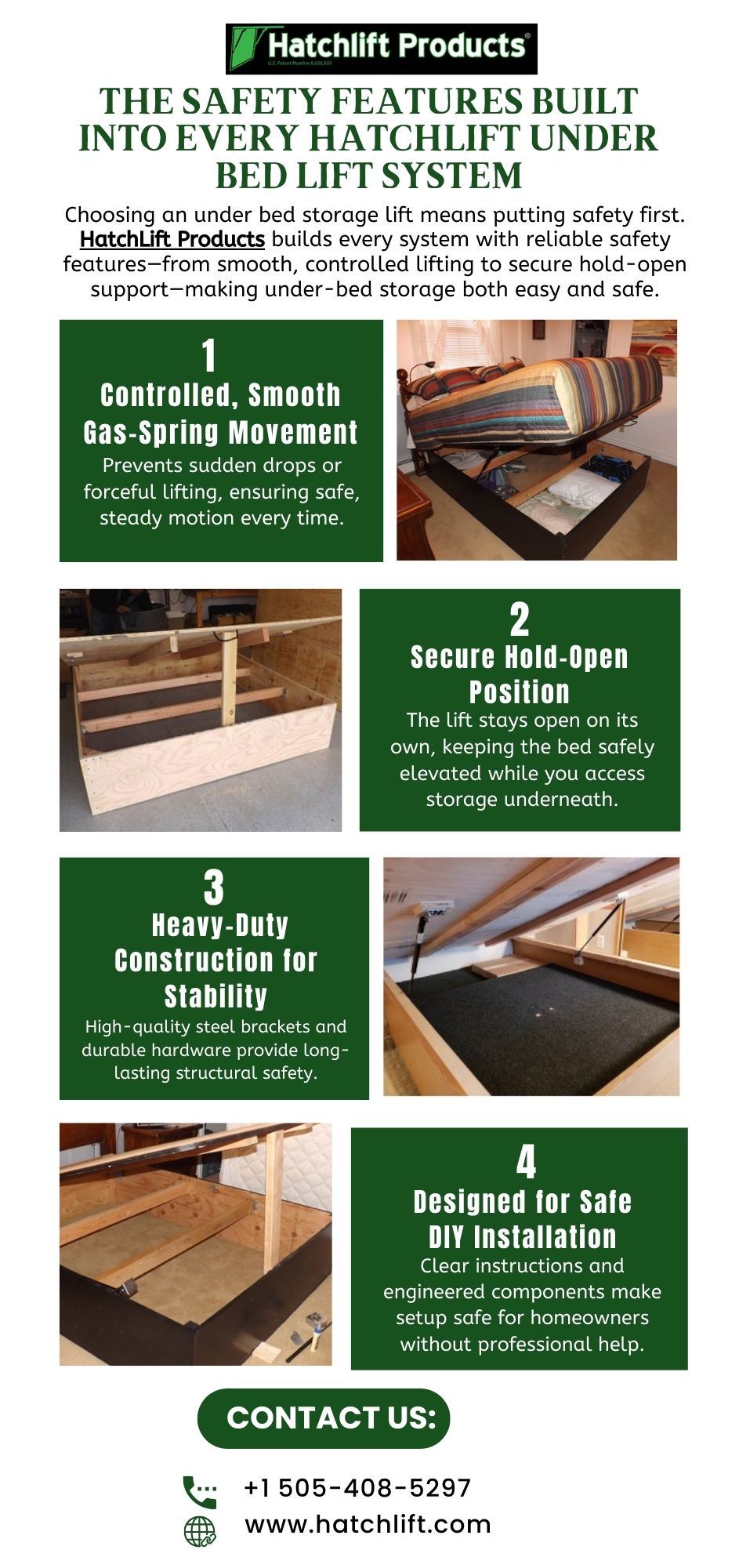 In this infographic, we cover how the Safety Features Built Into Every HatchLift Under Bed Lift System make your under bed storage lift safe, smooth, and effortless. Discover how controlled lifting, strong hardware, and secure hold-open support set HatchLift Products apart. For more details, call +1 505-408-5297 or visit: https://www.hatchlift.com/Platform-Bedlift-Kits--Residential-Use-Only_c_39.html