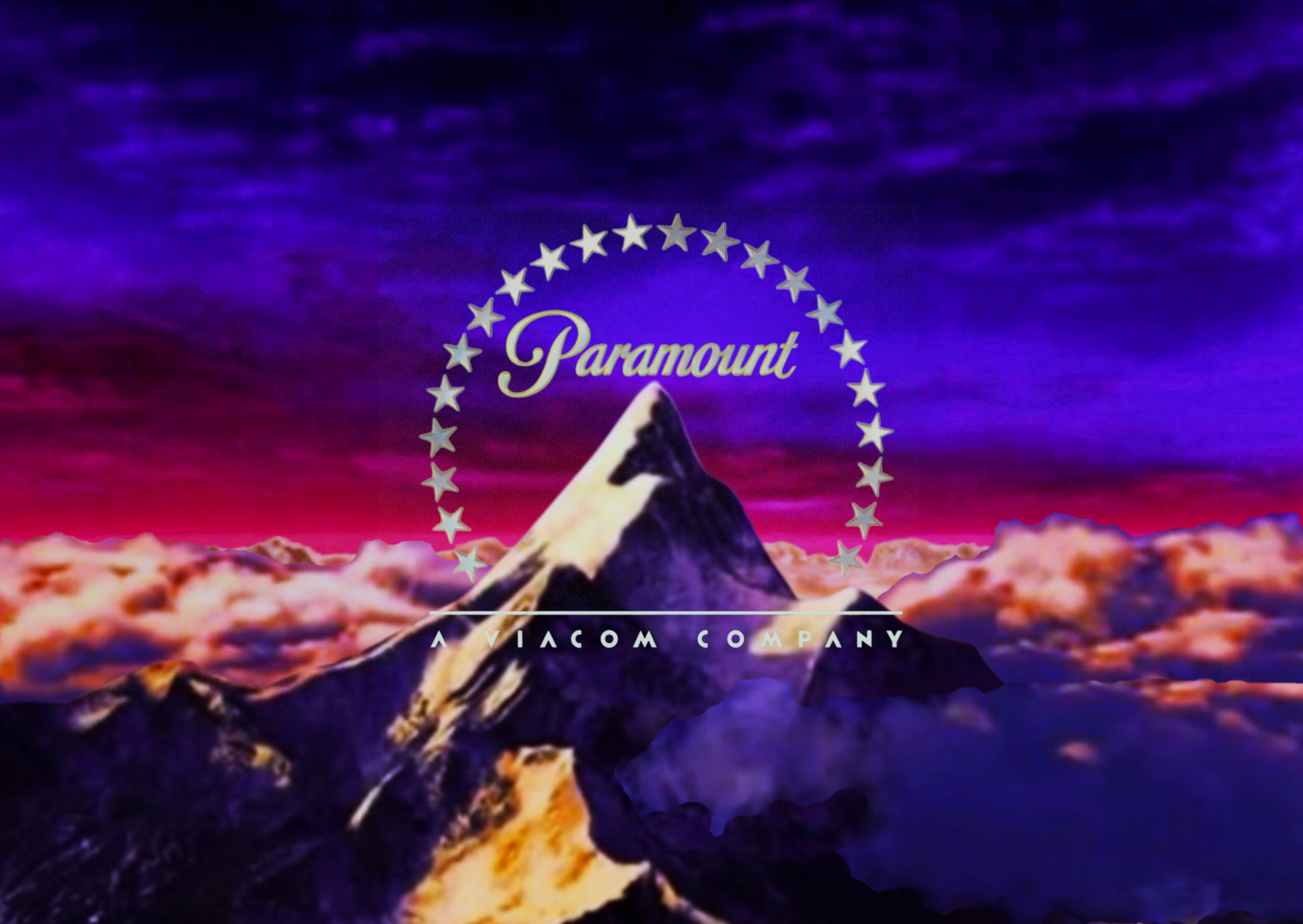 Logo: We see a majestic shot of a large amount of clouds, high over the earth, in space. In the distance, comet-like objects descend from the sky and as they zoom towards us, we see that they are the trademark Paramount stars, shooting towards us. The shot appears to "shimmer" a bit and then we see that we've been watching a reflection all along; the stars have been reflected through the familiar "Paramount" script. It too descends through the clouds above the stars, until we see a familiar mountain coming into view, now on a majestic sunrise-like background and surrounded by clouds. The stars zoom in below the script logo, which is now a silver color with a golden border, twisting and encircling the mountain. The script logo assumes its position above the mountain peak as the logo is completely formed. The Viacom byline then fades in under the logo.