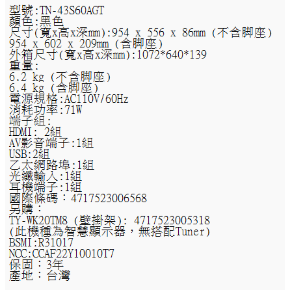 TN 43S60AGT規格