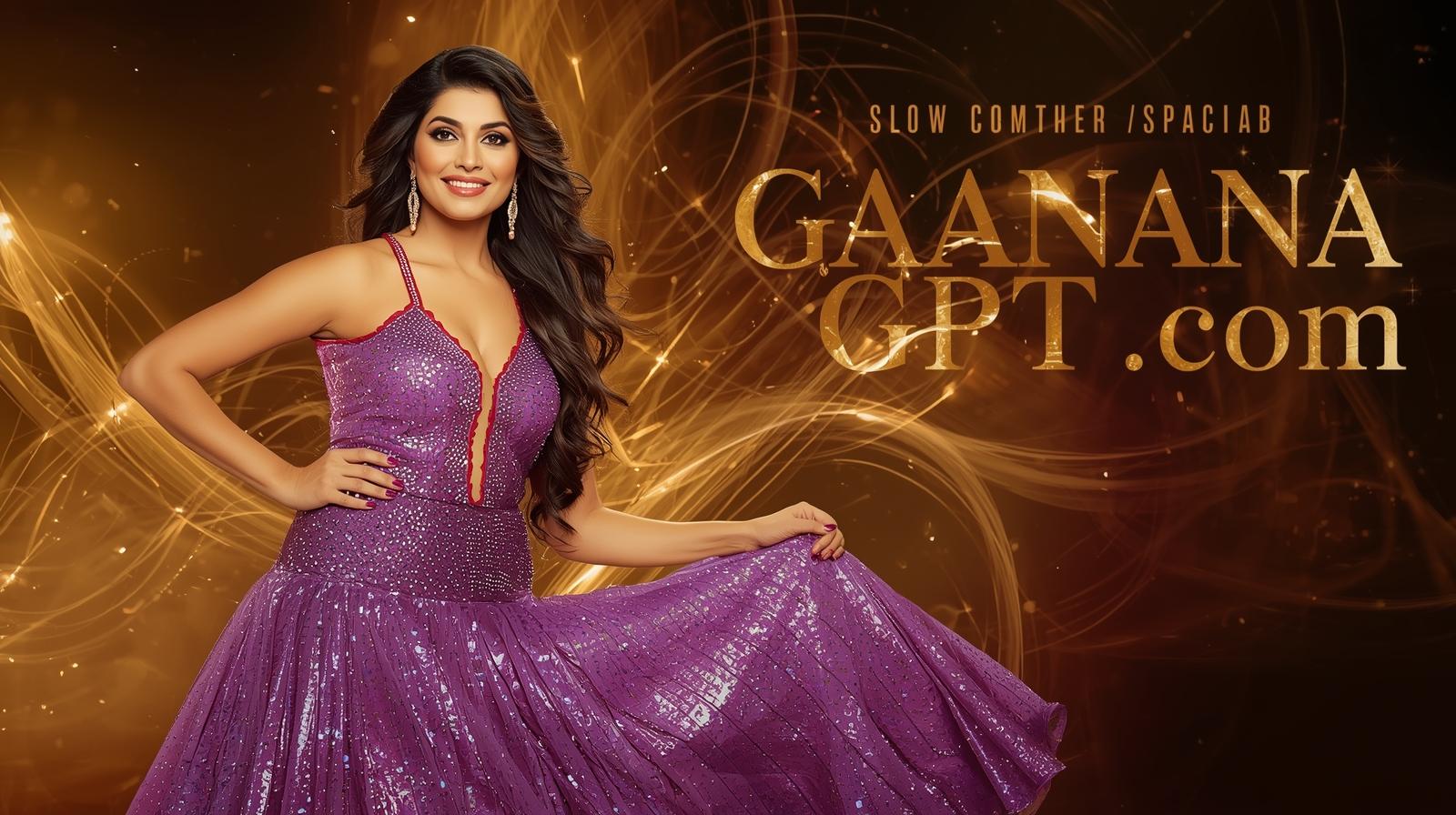Tollywood glam heroine in shiny purple dress with slow shutter light trails; “GaanaGPT.com” bold cin