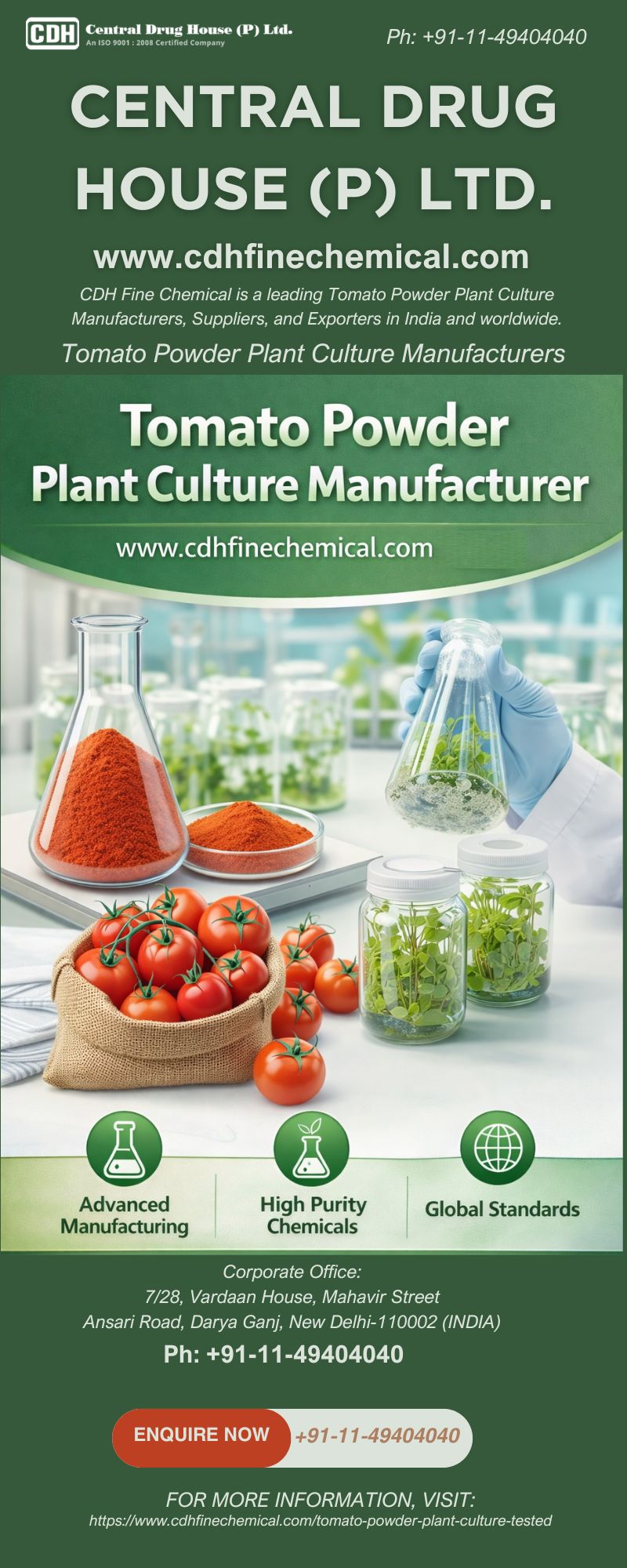 CDH Fine Chemical is a Tomato Powder Plant Culture manufacturer offering culture products for labs and industry. As a Tomato Powder Plant Culture Supplier, we provide worldwide shipping and ordering for customers. Enquire now! For more details, visit: https://www.cdhfinechemical.com/tomato-powder-plant-culture-tested