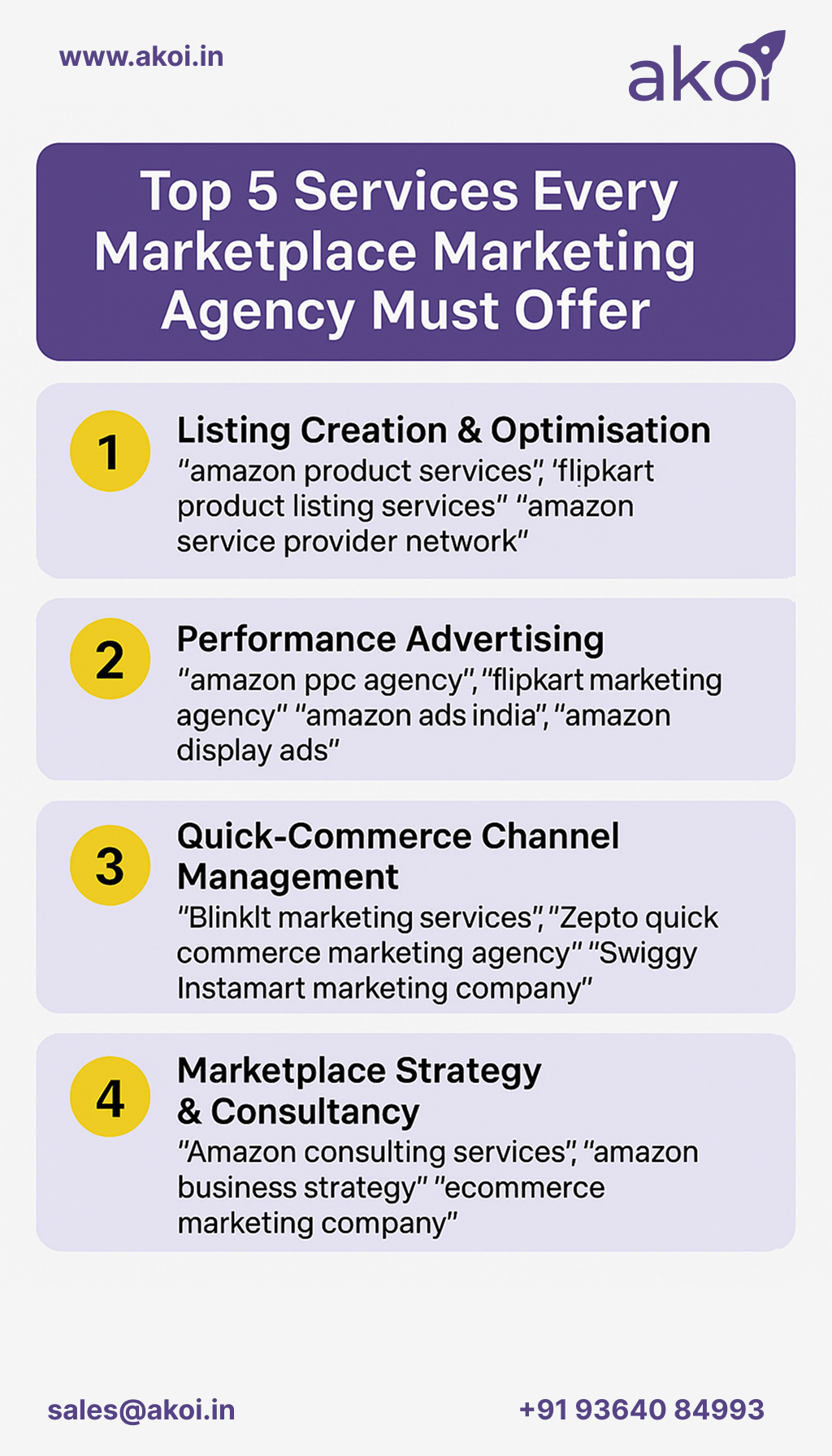 A successful marketplace marketing agency must deliver powerful listing optimization, high-performance advertising, full quick-commerce channel management, and strategic consulting across Amazon, Flipkart, BlinkIt, Zepto, Instamart, BigBasket, and Jiomart. Akoi helps brands scale with marketplace-ready content, data-driven PPC campaigns, and expert ecommerce marketplace marketing services designed for modern commerce growth.