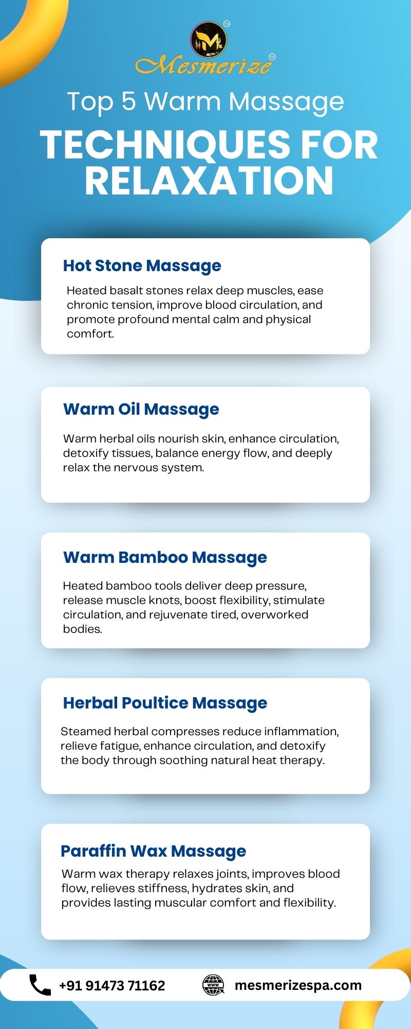 The most effective warm massage techniques help reduce stress, relax tense muscles, and enhance blood circulation naturally. From hot stone therapy to herbal treatments, these massages promote deep relaxation and overall wellness. Experience authentic healing at the thai spa kolkata for complete rejuvenation. Visit Mesmerize Spa for expert warm massage care.